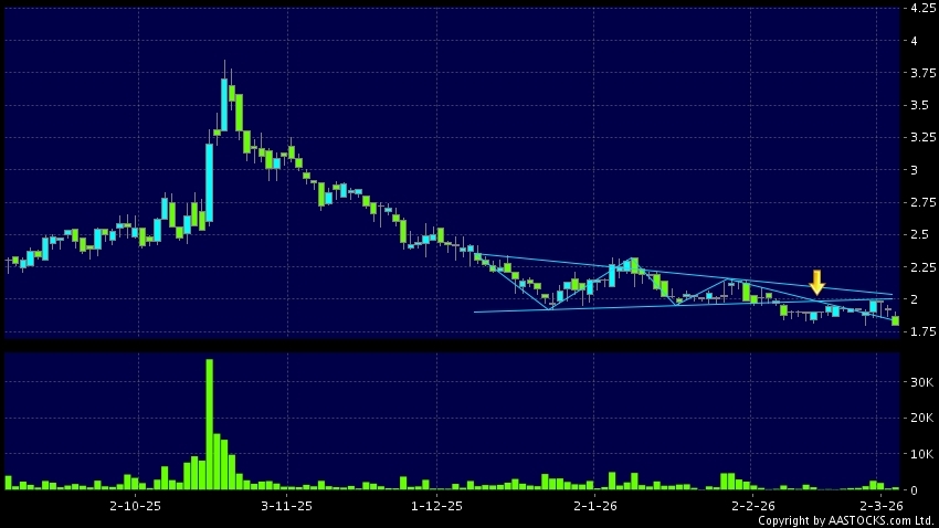 Triangle Breakout means the volatility of price movement is decreasing, stock price finally broke the bottom of triangle. A downward trend will start.(HK stocks quote is delayed for at least 15 mins.)