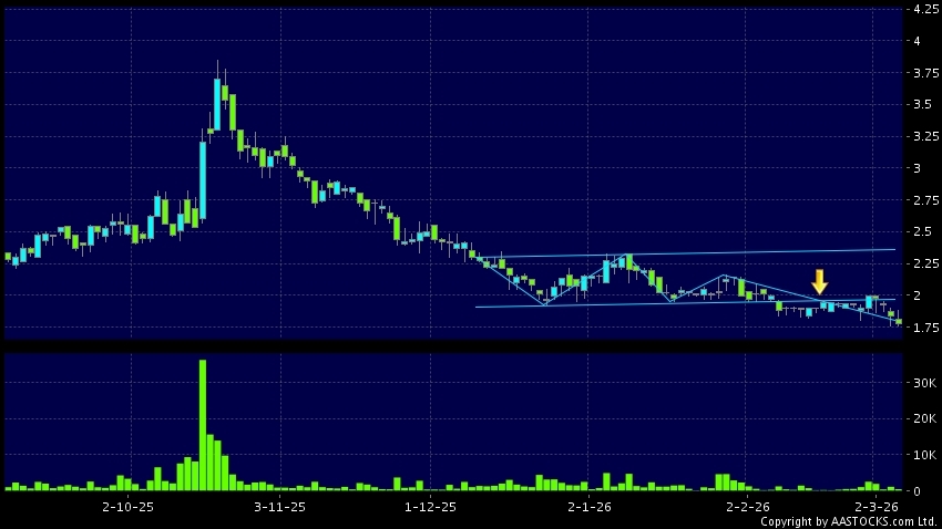 SCHOLAR EDU(01769.HK)  -0.020 (-1.235%)   appears a downside range breakout. Last printed at 1.790; fell 2.717%; on volume of 477.00K shares and turnover of $853.10K