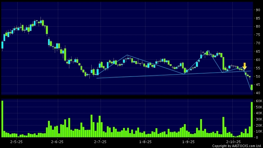 GIANT BIOGENE(02367.HK) appears a downside breakout, dropped below the neckline. Last printed at 41.820; fell 15.310%; on volume of 59.78M shares and turnover of $2.55BRecent Perfo...