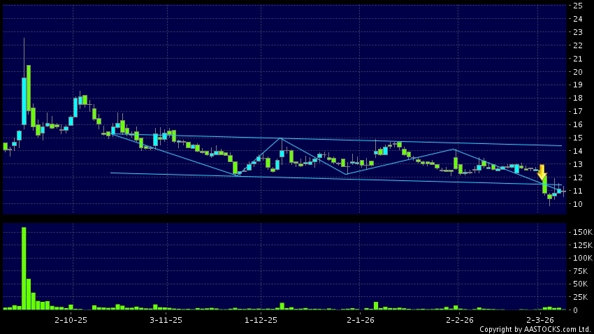 TYK MEDICINES-B(02410.HK) appears a downside range breakout. Last printed at 10.900; fell 1.802%; on volume of 1.27M shares and turnover of $13.79MRecent PerformanceIn 3 days: +5.1...