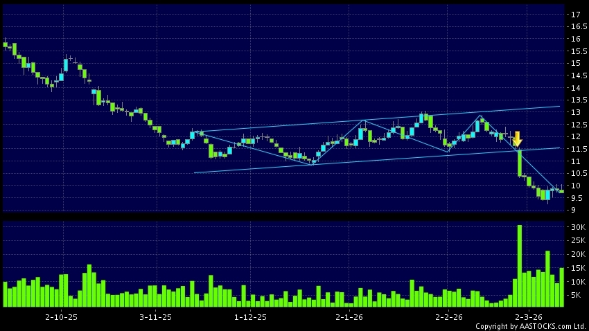 区域突破指股价在过去的一段时间只在一个范围在内活动,然後股价下跌作出突破,跌穿区域的底部,技术走势偏软。(港股报价延迟最少十五分钟。沽空资料截至 2026-03-13 16:25。)