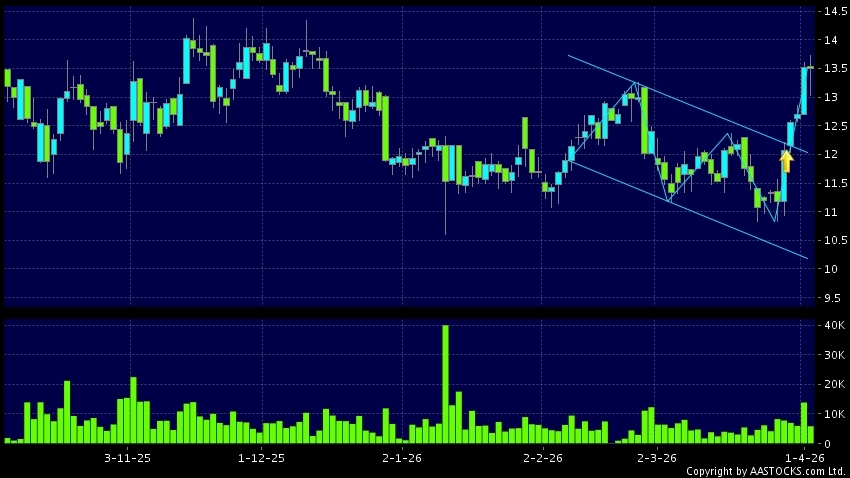 区域突破指股价在过去的一段时间只在一个范围在内活动,然後股价上升作出突破,升穿区域的顶部,技术走势向好。(港股报价延迟最少十五分钟。沽空资料截至 2026-04-02 12:25。)
