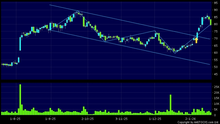 區域突破指股價在過去的一段時間只在一個範圍在內活動,然後股價上升作出突破,升穿區域的頂部,技術走勢向好。(港股報價延遲最少十五分鐘。沽空資料截至 2026-01-21 16:25。)