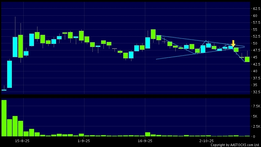 三角形向下突破是指股價的波幅漸漸收窄,在圖表上形成三角形般的狀態。股價在三角形的末端向下突破,下跌趨勢形成,技術走勢偏軟。(港股報價延遲最少十五分鐘。)
